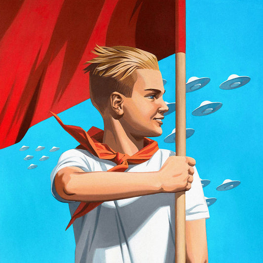Pioneer Boy UFO Poster – Blonde Soviet Youth with Red Flag – Futuristic USSR Space Parade Art