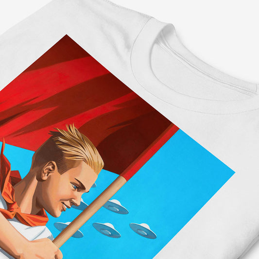Pioneer Boy UFO T-Shirt – Soviet Red Flag Space Parade Tee – Blonde Youth Futurist USSR Shirt