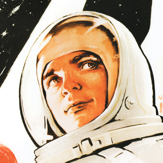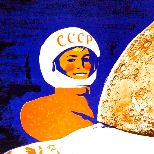 Soviet Space Poster – Female Cosmonaut Offering the Moon