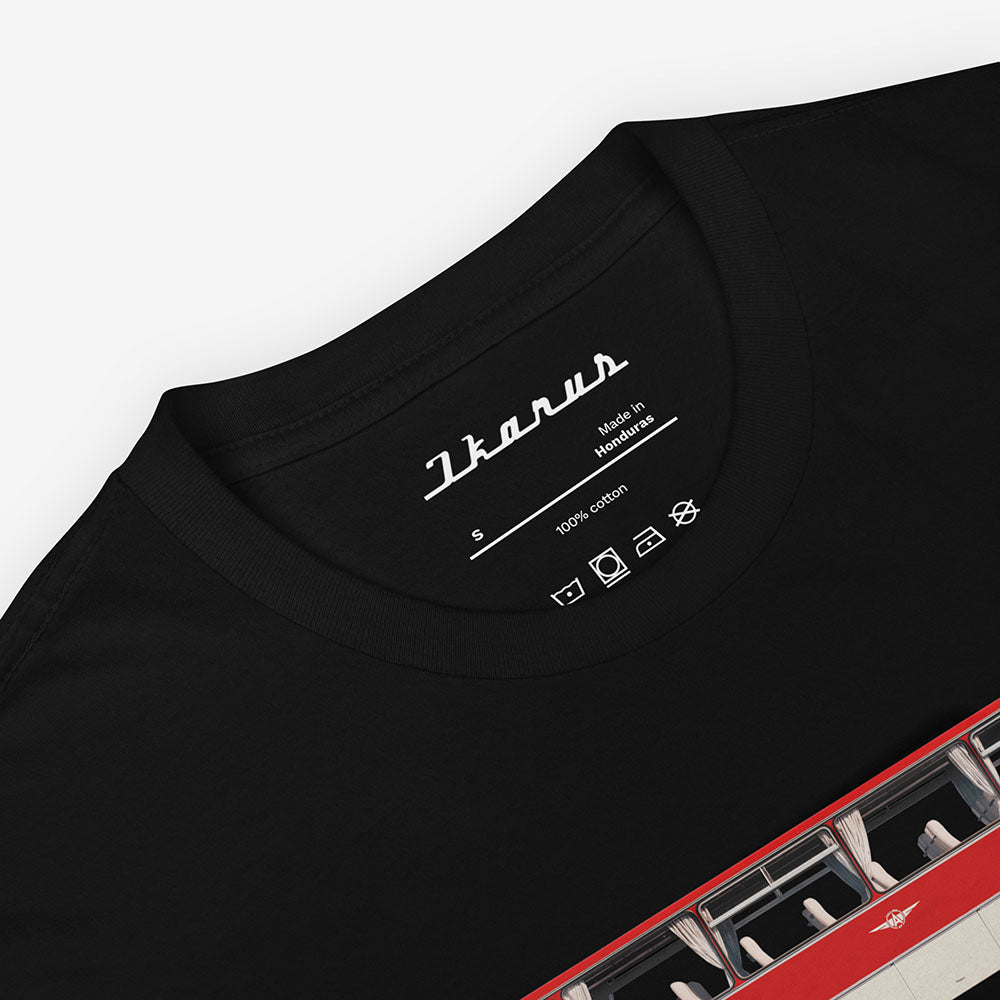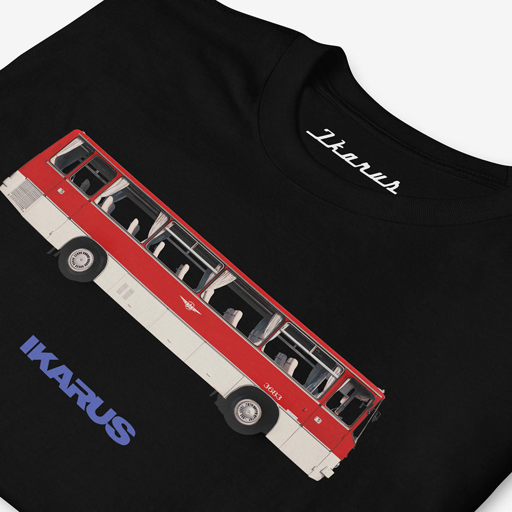 T-shirt with the legendary Ikarus bus, a design icon across the USSR, post-Soviet countries, and the whole Eastern Bloc and it's allies. Whether crawling through snowy city streets or carrying summer passengers across republics, the Ikarus defined everyday life in the socialist world.