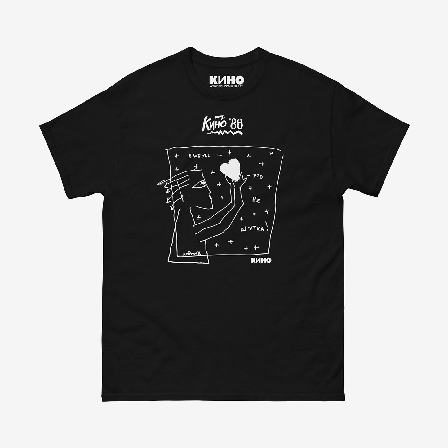 Black unisex Viktor Tsoi Gruppa Kino T-shirt with rare original design "Любовь это не шутка" (Love is no joke) album artwork. The graphic includes a drawn KINO'86, person with a heart and a subtle official KINO logo at the bottom.